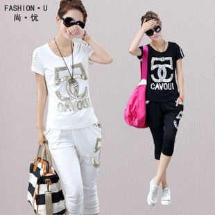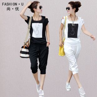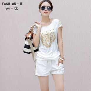 2015夏休閑套裝歐洲站新款短袖 時(shí)尚繡花釘珠女休閑套裝運(yùn)動(dòng)女 /