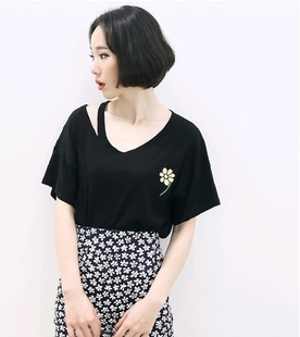 2015夏季肩部鏤空刺繡圓領(lǐng)短袖T恤打底衫+小碎花包裙套 /