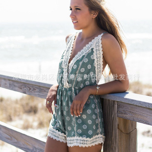 2015速賣通爆款歐美性感印花蕾絲花邊露背交叉綁帶連體褲 /