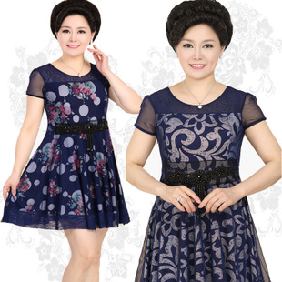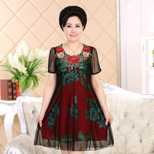 2015夏季新款女裝中老年連衣裙短袖網(wǎng)紗印花媽媽裝寬松型大碼衣服 /