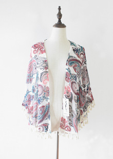 2015 夏季新品 流蘇復(fù)古雪紡花紋蝙蝠袖雪紡?fù)馓?防曬衣# /