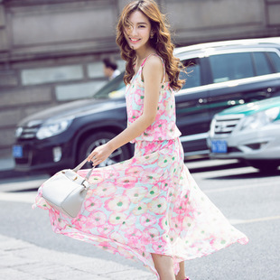 2015夏歐美新款大花圖案前開叉暗裹胸吊帶裙真絲女連衣裙長裙大碼 /