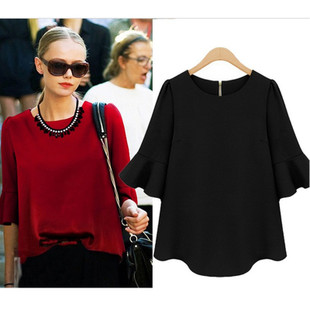 歐美純色女式大碼女裝 胖mm寬松加大五分喇叭袖雪紡時(shí)尚復(fù)古t恤 /