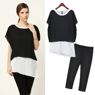 2015夏裝新 胖MM歐美大碼修身假兩件雪紡衫上衣+七分打底褲女套裝 /