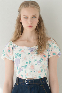 2015春夏 titty&co清新甜美一字領(lǐng)露肩壓褶印花短款雪紡衫小上衣 /