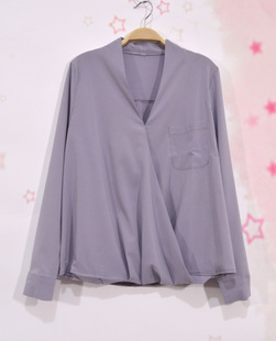 2015春夏 小香風(fēng)氣質(zhì)薰衣草V領(lǐng)褶皺寬松大碼上衣襯衫長袖襯衣 女 /