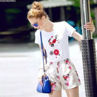 時(shí)尚大牌女裝走秀款繡花美女圖圓領(lǐng)短袖T恤+印花短褲套裝 /
