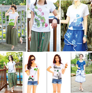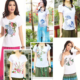 2015新款夏裝民族風(fēng)荷花牡丹刺繡印染純白全棉串珠T恤女裝 /