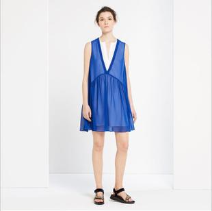 歐洲Sandro同款15春夏新款寶藍(lán)色白拼色無袖正品短裙連衣裙現(xiàn)貨 /