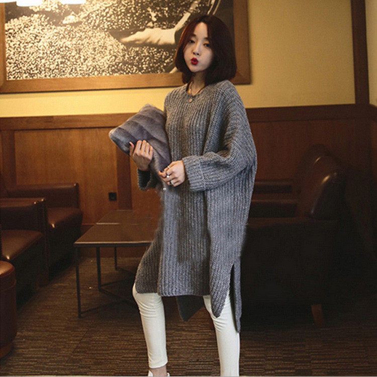 歐洲站2015秋冬歐美大牌長款寬松蝙蝠袖純色圓領套頭毛衣女 /