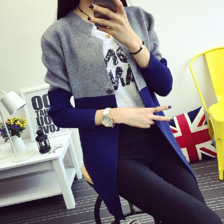 2015秋裝韓版新款撞色簡約寬松中長款針織開衫外套女裝 /