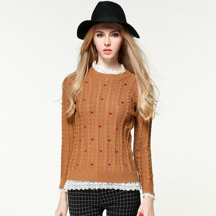 2015秋冬新款甜美顯瘦針織毛衣 圓領(lǐng)長(zhǎng)袖荷葉邊心形刺繡針織毛衣 /