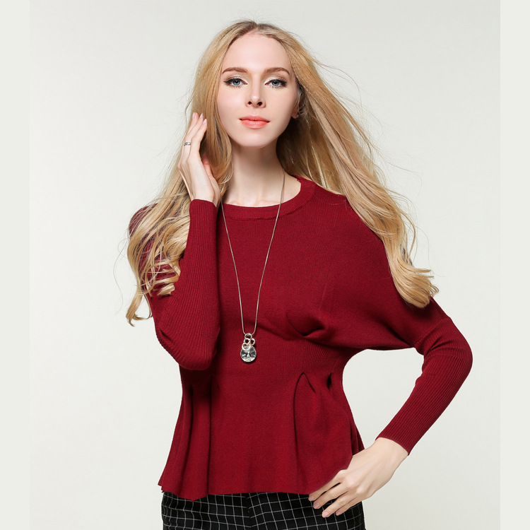 2015秋冬歐洲站新款甜美針織衫 圓領(lǐng)收腰荷葉下擺套頭毛衣針織衫 /