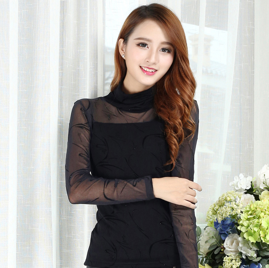 蕾絲衫2015秋裝新款韓版女裝長袖上衣雪紡衫高領(lǐng)打底衫 /