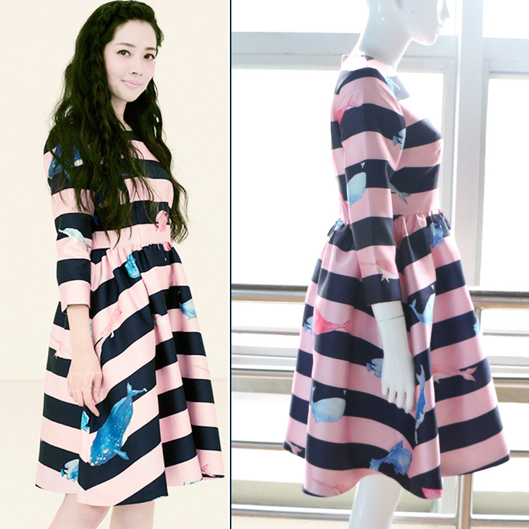 2015秋冬女神新裝郭碧婷同款海底世界七分袖藍(lán)粉條紋小魚連衣裙 /