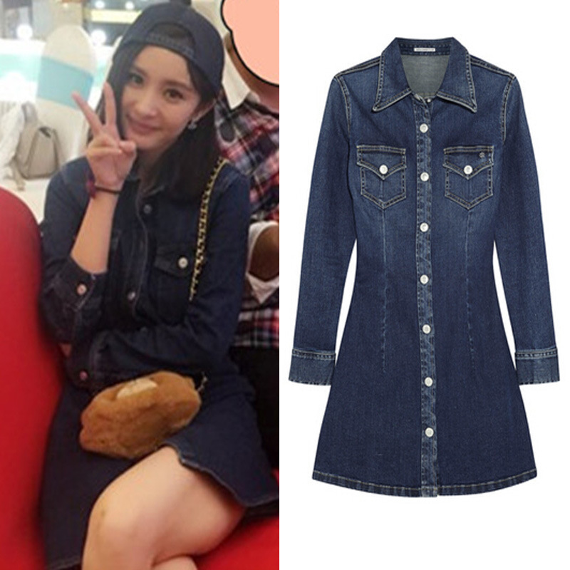 Alexa Chung AG 2015秋冬楊冪同款牛仔連衣裙長袖修身牛仔衫 /