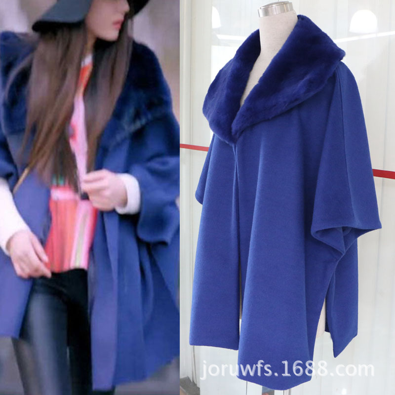 克拉戀人迪麗熱巴高雯同款藍(lán)色斗篷式7分袖兔毛領(lǐng)毛呢大衣女外套 /