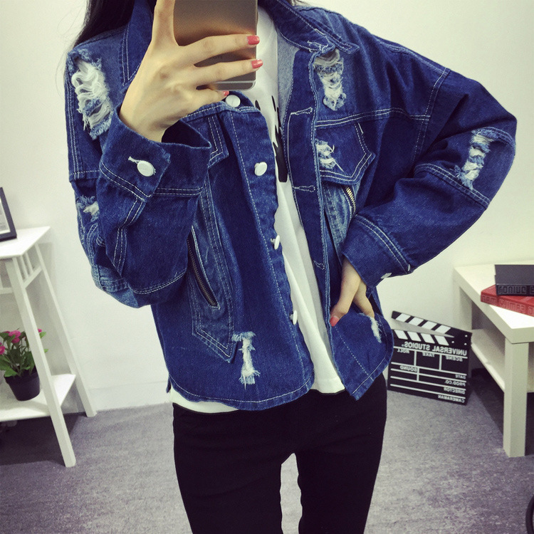實拍2015秋季新品女裝韓版上衣牛仔服 寬松短款破洞牛仔外套 /