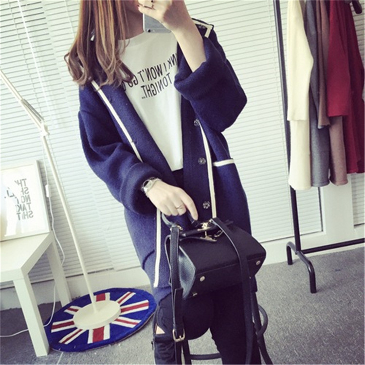 2015新款時尚韓版顯瘦翻領(lǐng)大口袋針織拼色開衫毛衣中長款女批發(fā) /