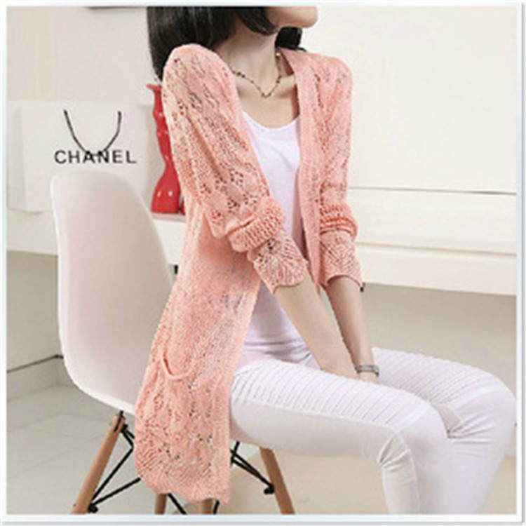 秋季新品韓版口袋修身顯瘦鏤空中長款開衫外套針織衫廠家貨源批發(fā) /