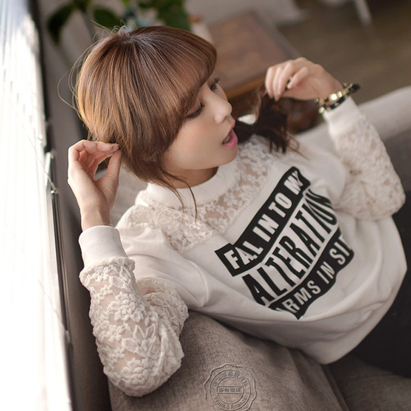 2015韓國女裝秋裝新款圓領(lǐng)純棉套頭女式衛(wèi)衣女秋冬蕾絲女士上衣 /