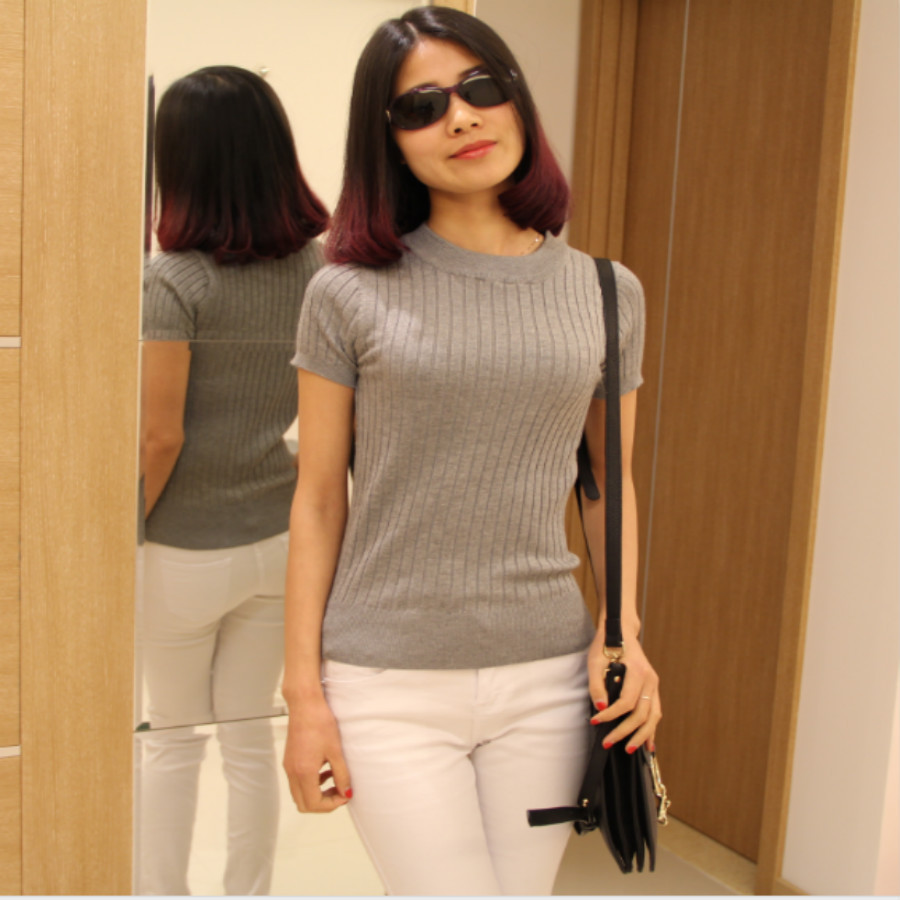 毛衣女短袖半高領女豎條螺紋百搭緊身潮春秋打底抗起球針織衫 /