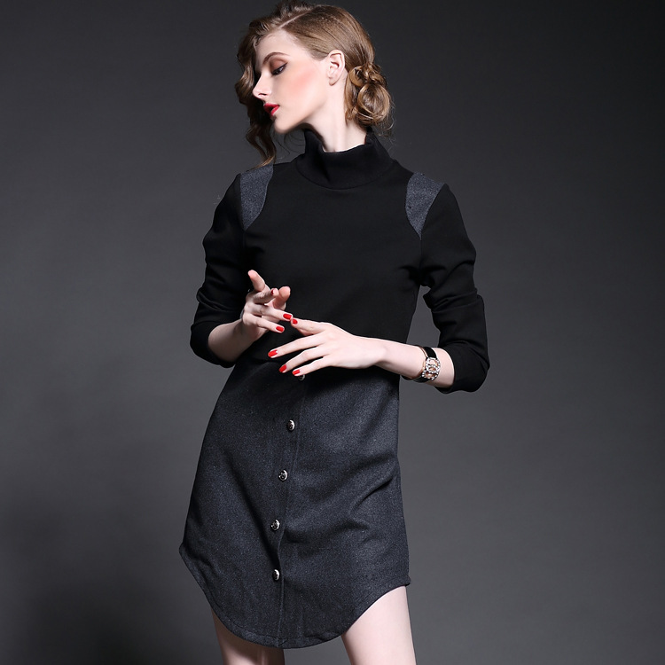 2015歐洲站女裝秋裝新款高領(lǐng)假兩件拼接連衣裙女顯瘦長(zhǎng)袖打底裙 /