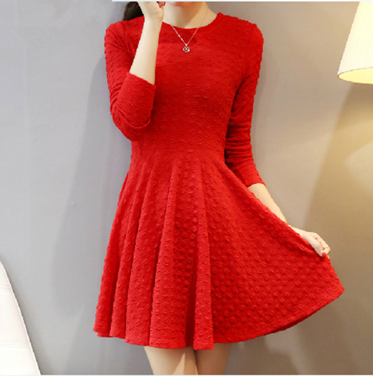 2015韓國 紅色針織連衣裙長袖女顯瘦氣質(zhì)小香風(fēng)a字裙 /