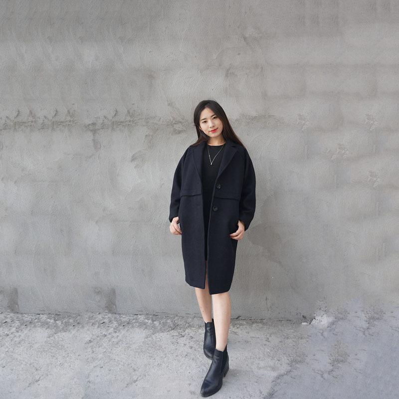 獨家定制原創(chuàng)設(shè)計藏青落肩廓形型寬松單排紐扣時尚羊毛呢大衣外套 /
