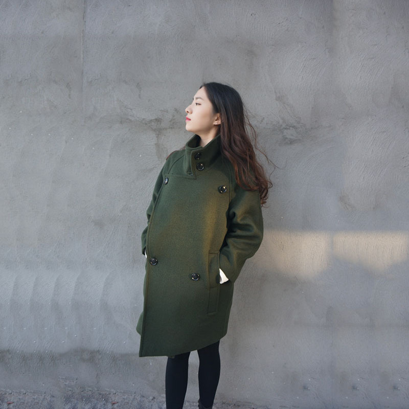 獨家定制原創(chuàng)設(shè)計軍綠落肩廓型寬松硬挺時尚羊毛呢大衣外套 /