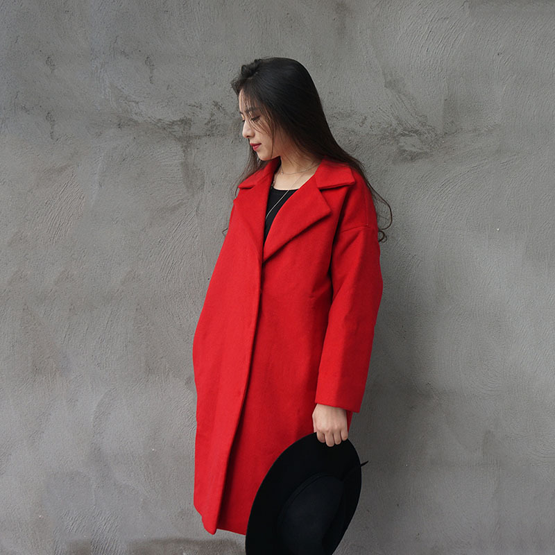 獨家定制原創(chuàng)設(shè)計正紅落肩廓形型寬松單排紐扣時尚羊毛呢大衣外套 /