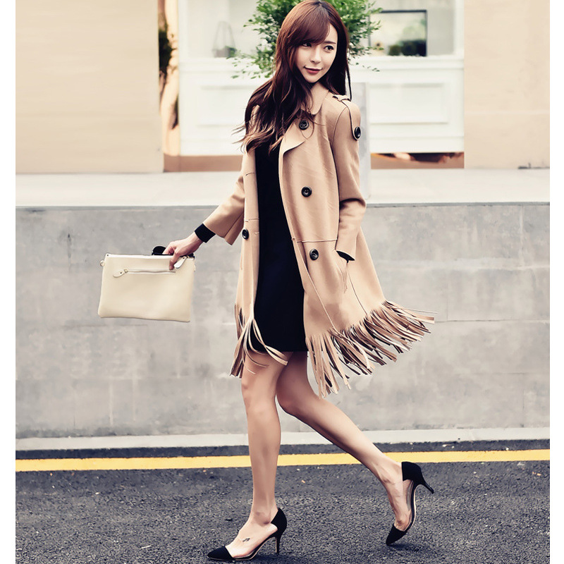 2015秋冬歐美女裝大牌外套 麂皮絨修身風(fēng)衣 時(shí)尚流蘇中長款大衣 /