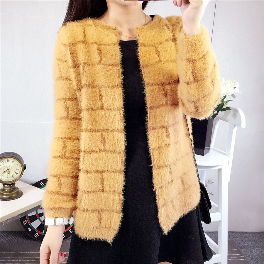 2015秋冬新款 純色城墻格 仿貂絨外套學(xué)生女氣質(zhì)針織開衫 /