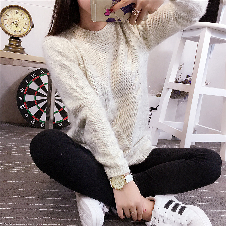 2015新款秋冬 韓版貓毛小口袋針織套頭中長款毛衣學(xué)生外套女 /