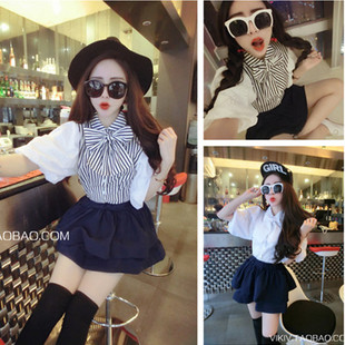 • 2015春夏甜美氣質(zhì)蝴蝶結(jié)領(lǐng)蕾絲中袖襯衣+半身高腰兩層短裙套裝女 /