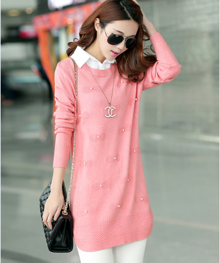 2015秋冬季新款韓版女裝假兩件毛衣女針織打底衫套頭中長款 批發(fā) /
