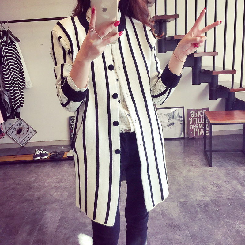 2015秋季促銷豎條紋開衫后背棒球風針織開衫韓國寬松毛衣外套女裝 /