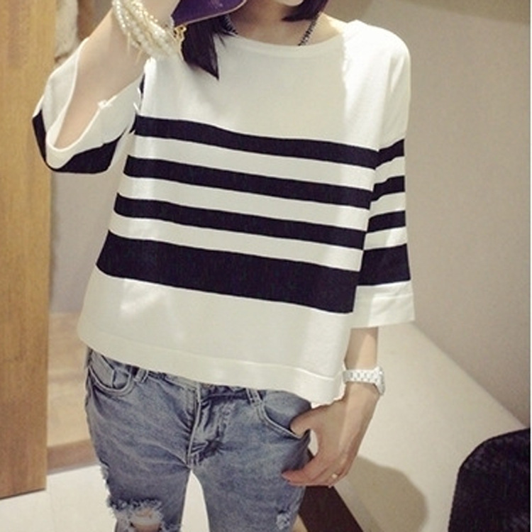 2015秋冬季新款中袖T恤韓版女裝針織打底寬松短袖條紋T恤衫 批發(fā) /