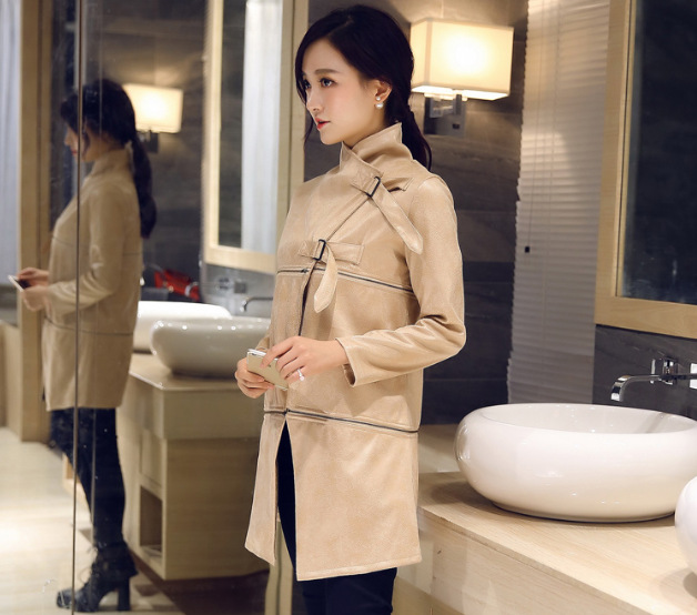 秋冬女裝新款歐美大牌拼接風衣鹿皮絨中長款外套長短兩穿 /