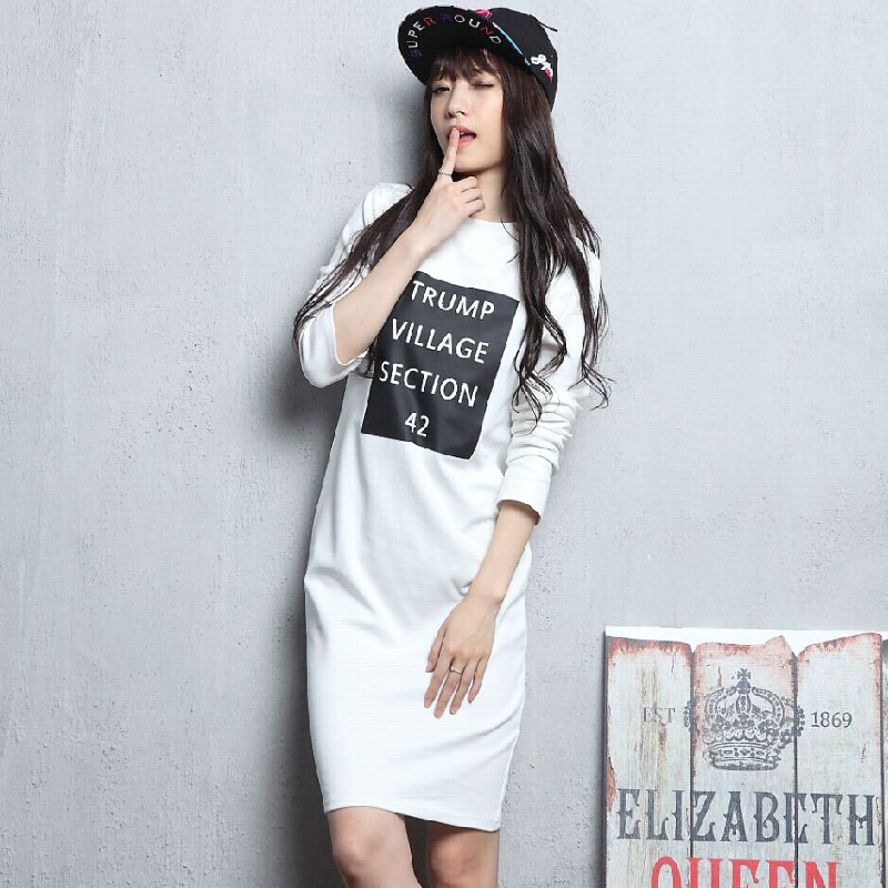 2015秋季新款韓版印花長袖t恤女 修身中長款連衣裙 打底衫女 /