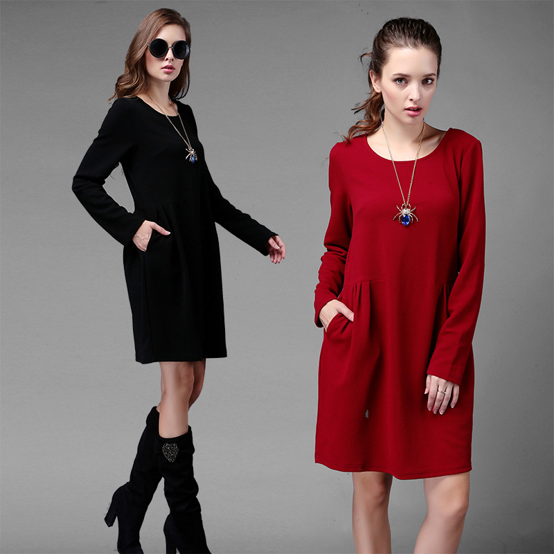 2015歐美大碼女裝秋款 胖mm寬松圓領打底連衣裙 新款長袖連衣裙 /