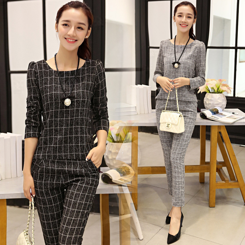 2015秋裝韓版新品棉麻格子兩件套長(zhǎng)褲小香風(fēng)名媛長(zhǎng)袖套裝女 /
