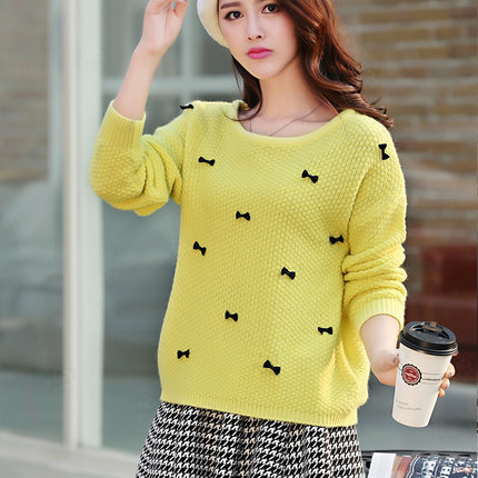 2015秋冬新款韓版時(shí)尚蝴蝶結(jié)紐扣裝飾套頭針織衫毛衣女 /