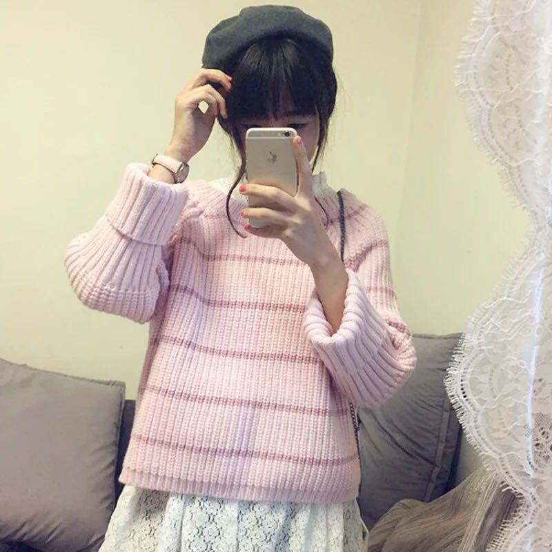 2015秋季韓版學(xué)院風(fēng)學(xué)生毛衣套頭女韓國(guó)潮厚寬松條紋外套 /