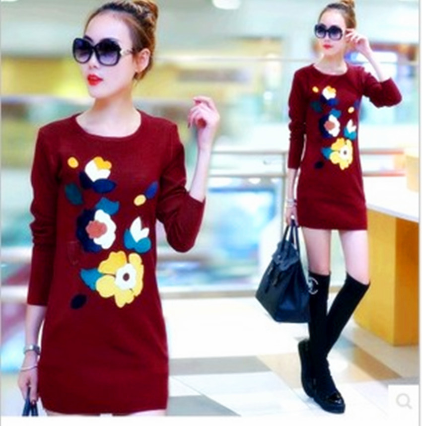 顯瘦打底衫2015秋冬新款女裝中長(zhǎng)款加厚印花套頭修身針織衫毛衣 /
