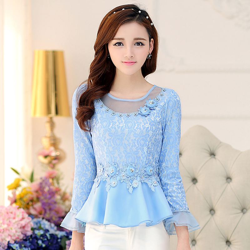 2015秋季新款韓版女裝上衣小衫 修身顯瘦鏤空長袖蕾絲衫女批發(fā) /