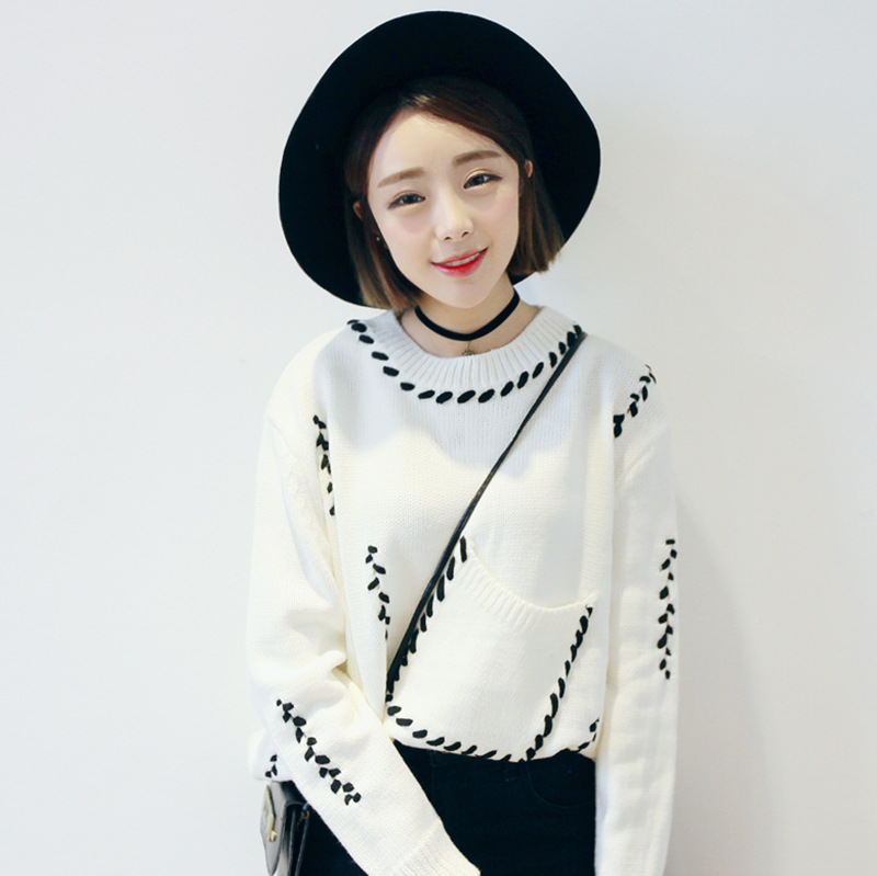 學(xué)院風(fēng)中長款冬款女裝毛衣女套頭韓版寬松外套中學(xué)生針織衫口袋潮 /