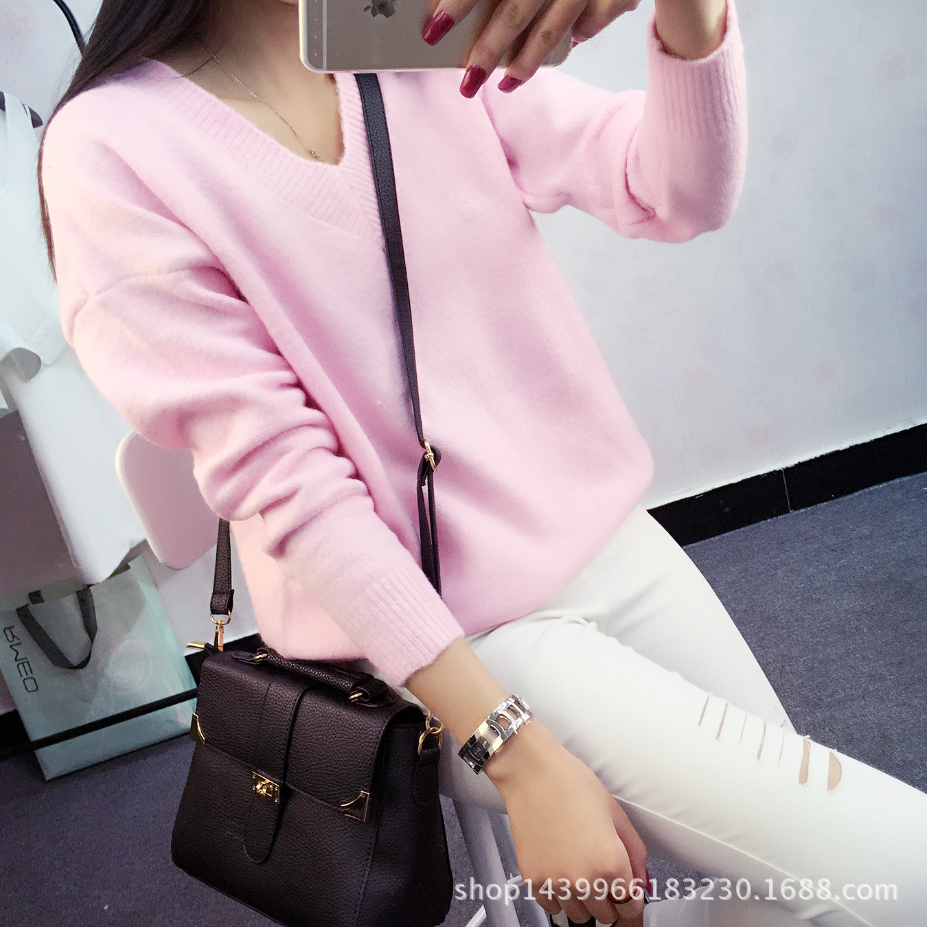 2015秋冬新款韓版V領(lǐng)寬松性感純色打底套頭針織衫毛衣女厚 /
