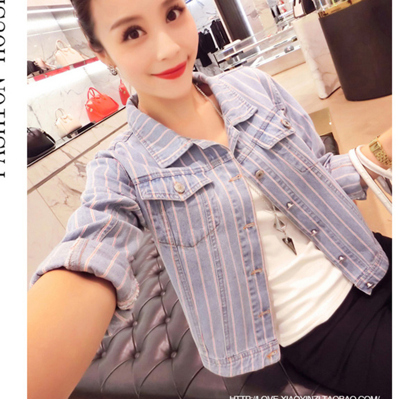 爆款女裝2015秋裝新款韓版牛仔衣條紋拼色顯瘦短外套女現(xiàn)貨潮 /