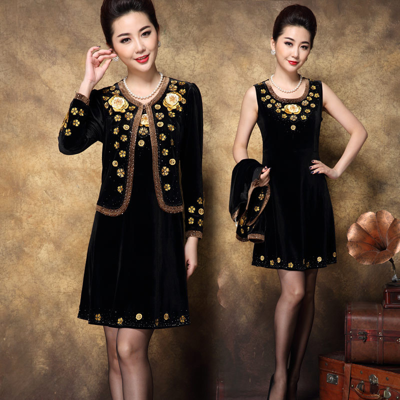 2015中老年女連衣裙套裝金絲絨立體刺繡兩件套裙婚禮媽媽裙 /